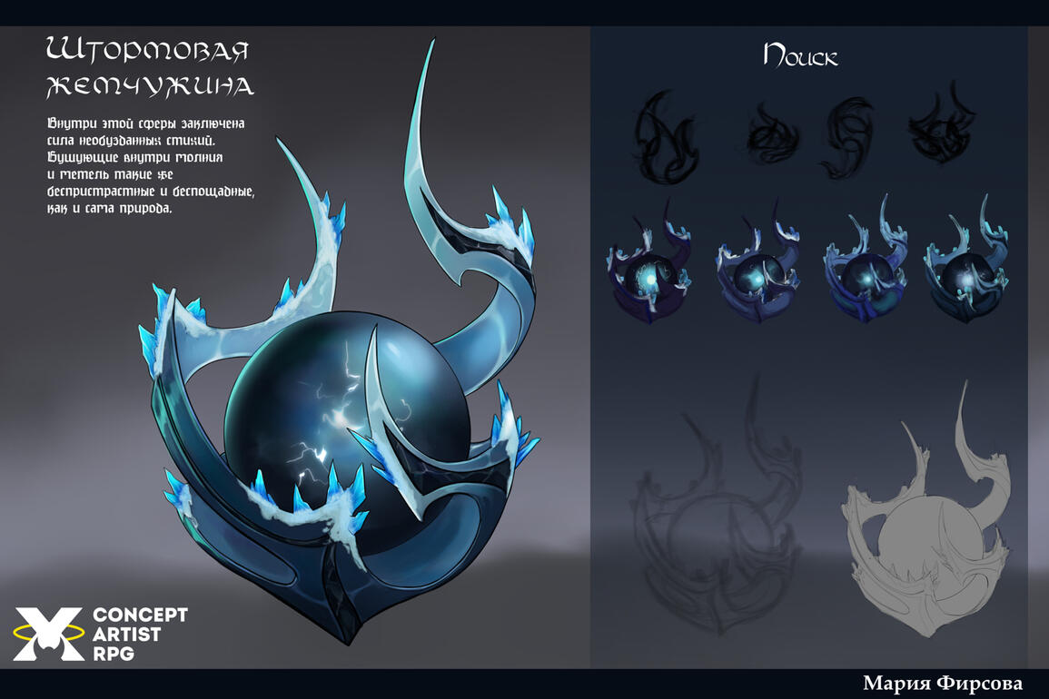 Design development of a custom item/prop. The layout in form of a concept art with simply rendered main subject, main stages of development and major details.